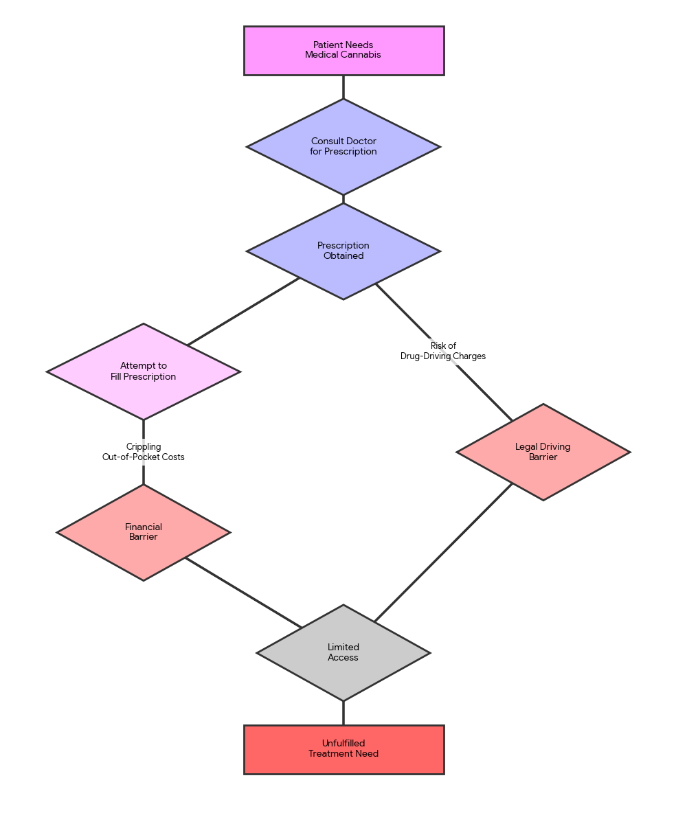 This creates a situation where using legally prescribed medication can lead to criminal charges, effectively forcing patients into an impossible choice between their health and their mobility. Legal experts at Coutts Legal highlight that the current framework means patients face "potential legal consequences... even if they are using cannabis for medical purposes" [8].